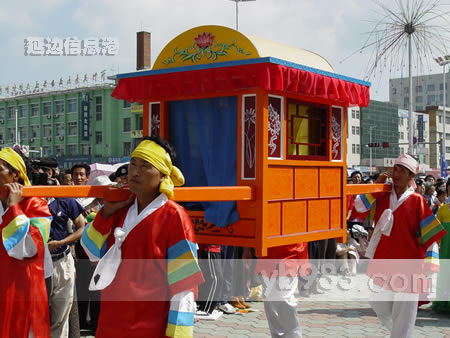 在“新娘”家,新郎從雁夫手中接過用彩緞包裹的木雁,然后交給前來迎接的岳父,岳父再把木雁橫放在奠雁桌上。新郎跪在奠雁桌前,雙手橫握錦扇,輕推木雁三次,表示新郎對愛情的忠貞不渝。這在婚禮中被稱作“奠雁禮”。