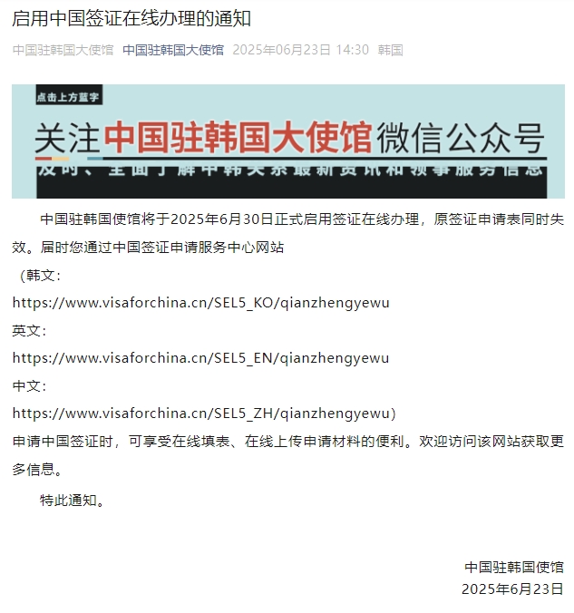 ???? ?????? 2025? 6? 20??? ?? ????????? ???? ???? ?? ?? ??? ?????? ?? ???? ??? ????. ???? ??????????? ????(??:https://www.visaforchina.cn/SEL5_KO/qianzhengyewu ??:https://www.visaforchina.cn/SEL5_EN/qianzhengyewu ???:https://www.visaforchina.cn/SEL5_ZH/qianzhengyewu)? ?? ?? ??? ??? ? ??????? ???? ????? ??????? ?? ??? ???? ????? ? ? ??. ??? ??? ?? ????? ???? ???.